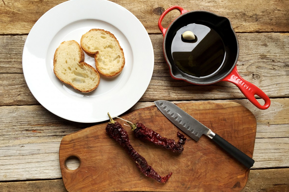 Togliere l’aglio e bagnare le fette di pane con questa salsa.