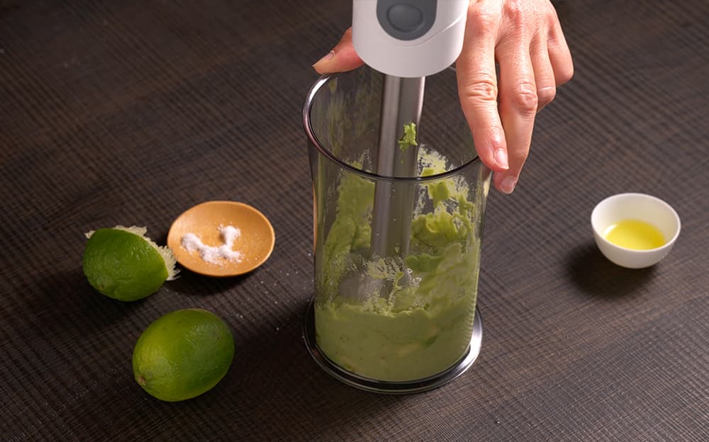 Sbucciate l’avocado e frullate la polpa con olio, sale e il succo di lime.