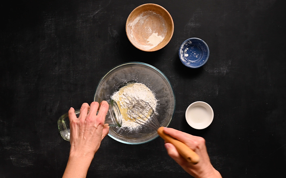 Mettete le farine, il sale e l’olio in una terrina e mescolate con una frusta aggiungendo l’acqua, fino ad ottenere una pastella liscia e senza grumi.
