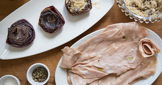 Con le fette di Mortadella Bologna IGP piegate e arrotolate su se stesse crea delle rose da posizionare all’interno delle cipolle farcite.