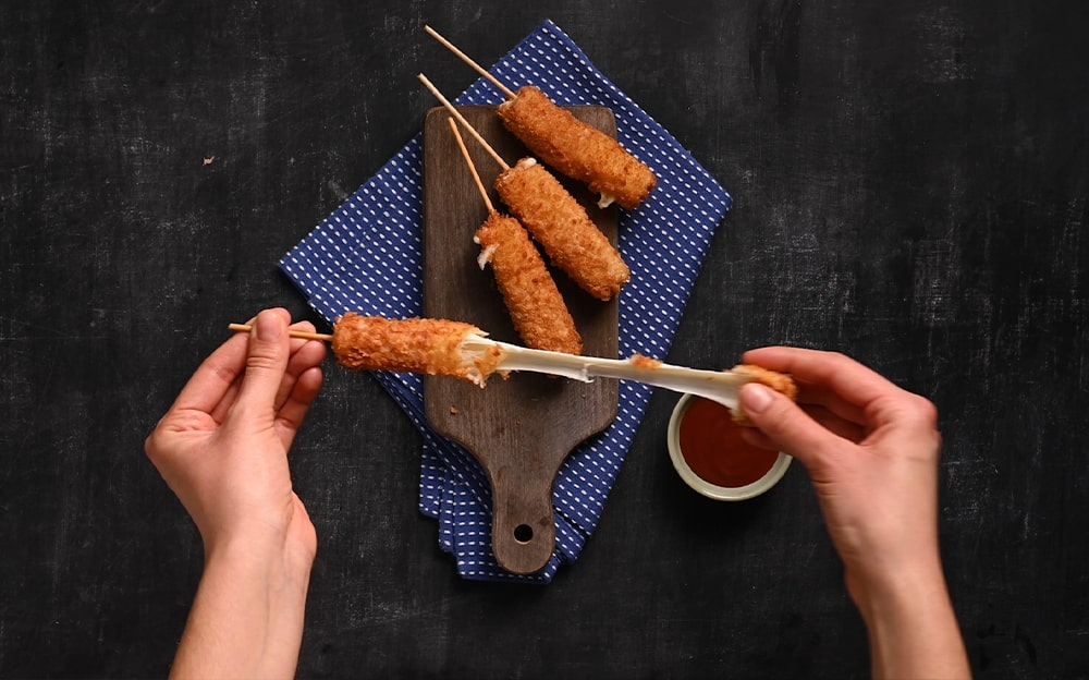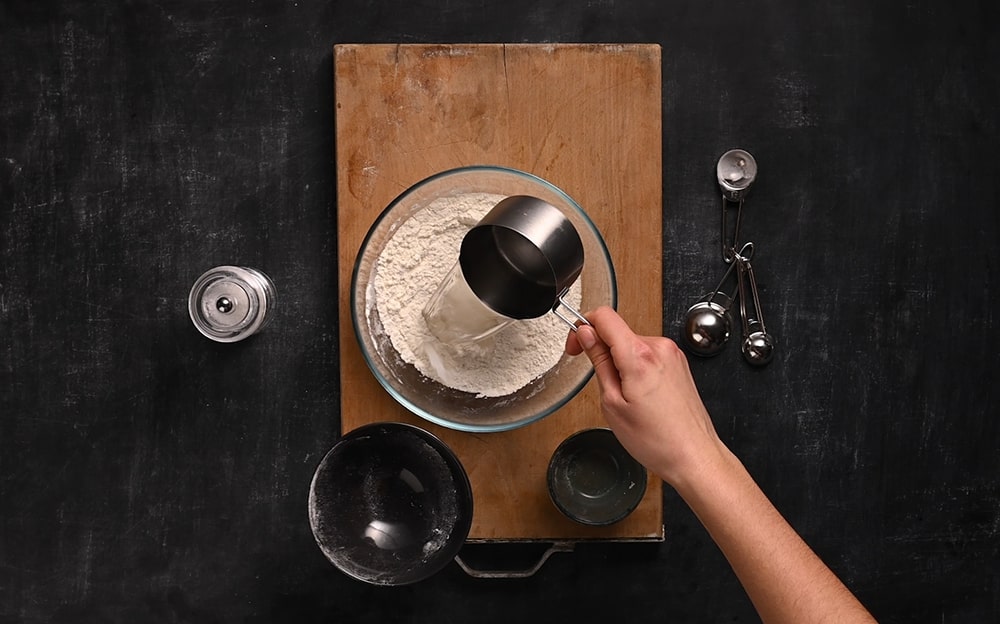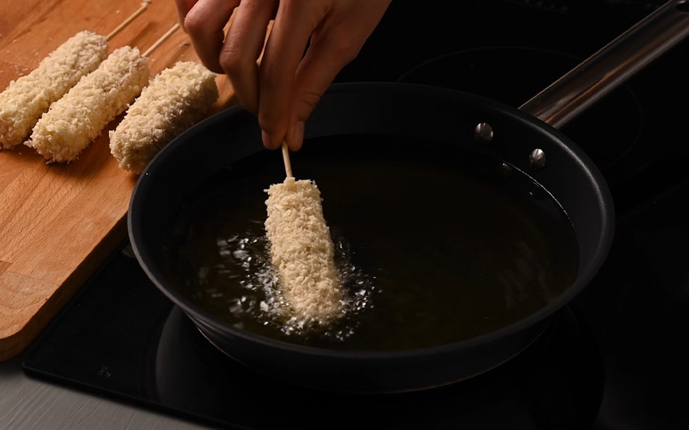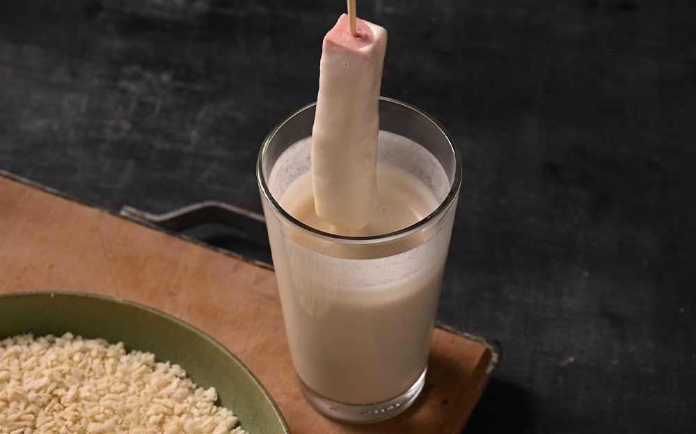 Preparate la pastella: mettete gli ingredienti secchi in una ciotola e aggiungete l’acqua mescolando con una frusta. Versatela in un contenitore alto e stretto e lasciate riposare.