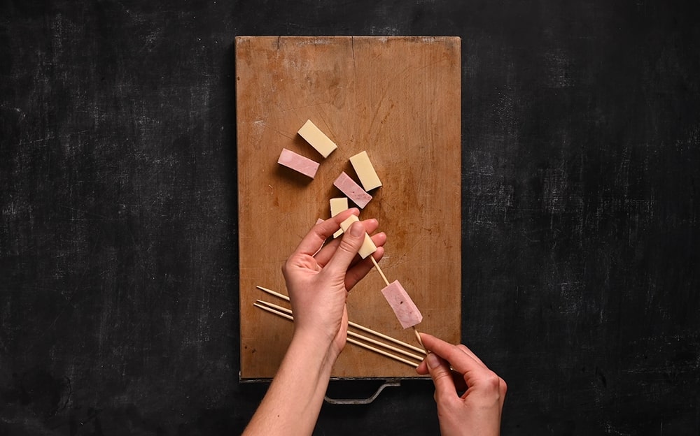 Create degli spiedini alternando la mozzarella e la Mortadella Bologna IGP.