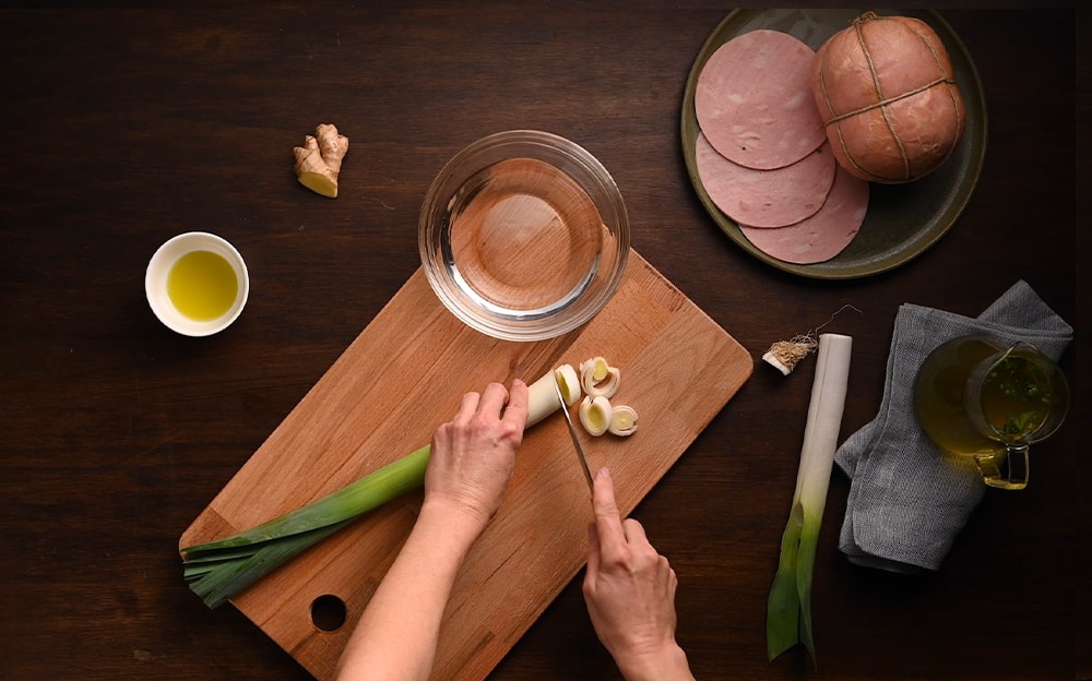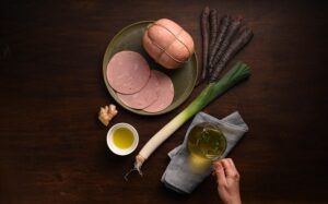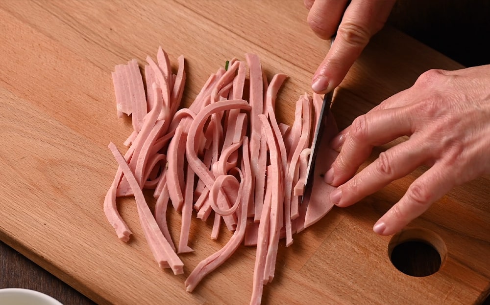 Tagliate la Mortadella Bologna IGP in strisce sottili.