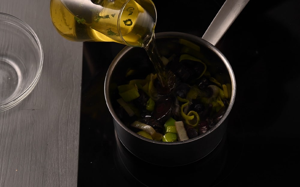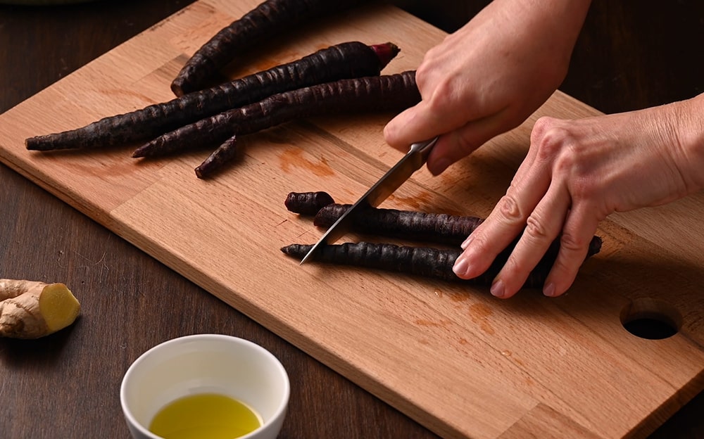 Affettate il porro e fatelo rosolare in padella con un filo d’olio. Aggiungete le carote e fate rosolare.