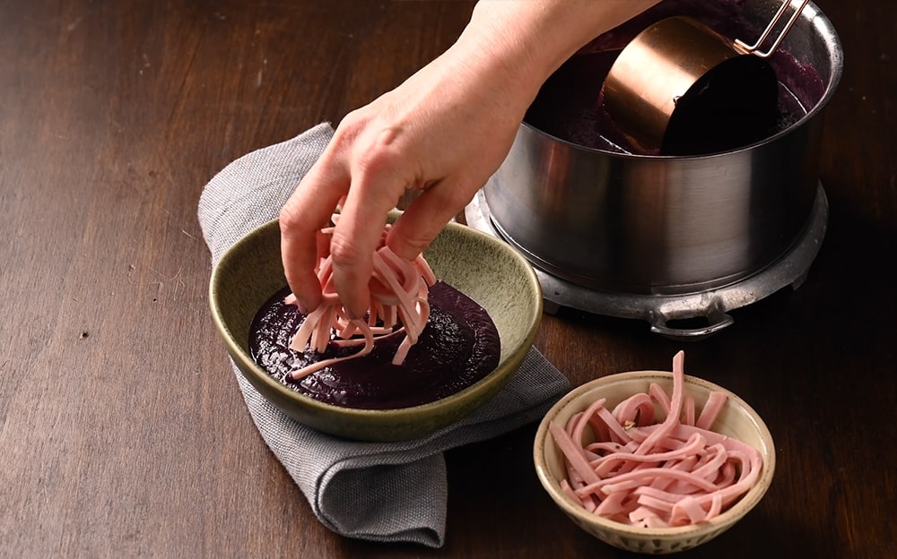 Versate la crema nei piatti e decorate con i nastri di Mortadella Bologna IGP e crostini.