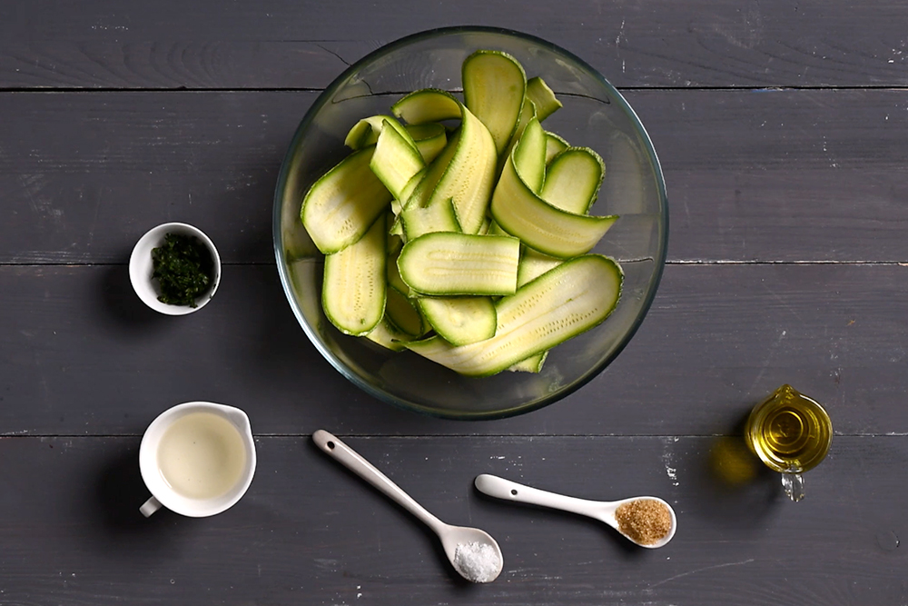 Affetta le zucchine e condiscile con aceto, sale, zucchero e la menta ed il basilico tritati. Lascia marinare.