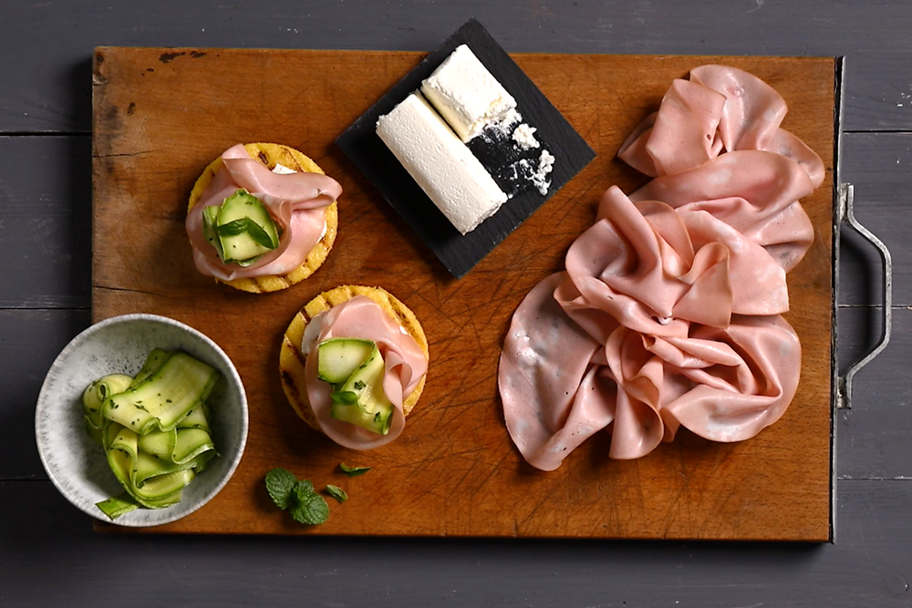 Componi i crostoni spalmando del caprino, aggiungi la Mortadella Bologna IGP e le zucchine marinate.
