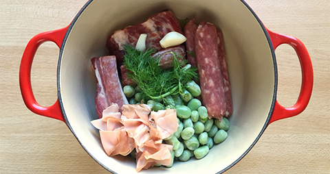 In un tegame mettere tutti i tipi di carne tagliati a pezzi, la Mortadella Bologna IGP tagliata a listarelle, le fave sbollentate (se secche lasciarle a bagno per una notte e poi cuocerle per 2 ore), il finocchietto selvatico.