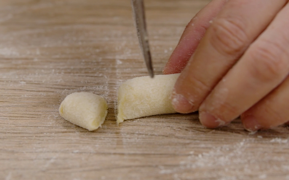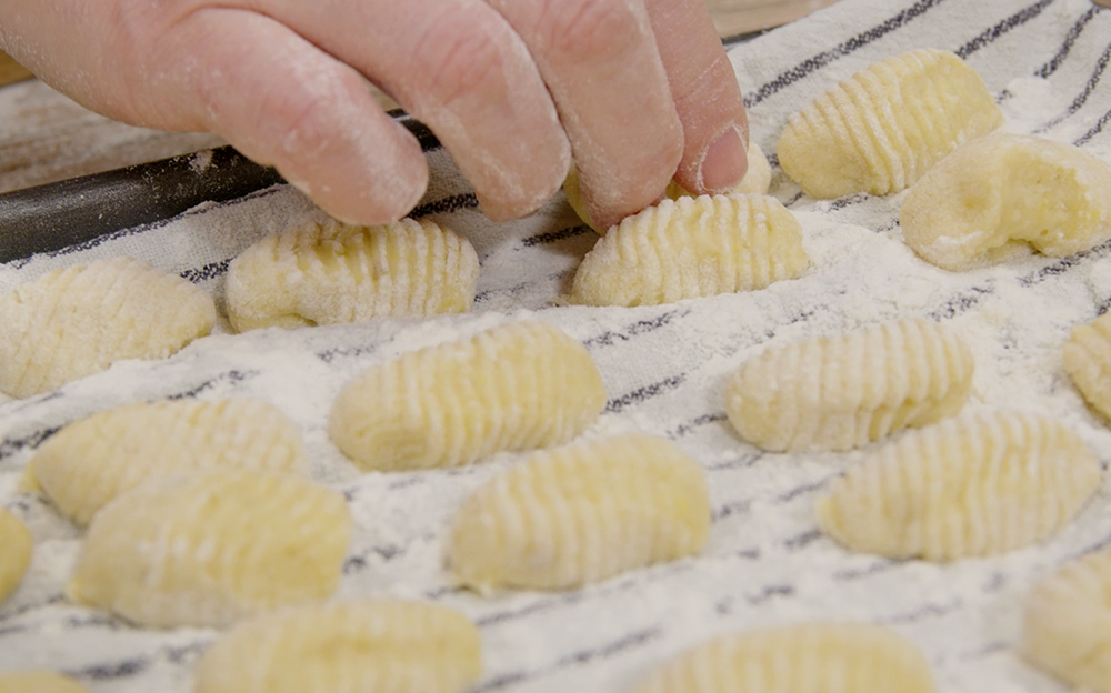 Ottenuto un impasto lavorabile, taglia piccole porzioni. Ottieni dei filoncini dello spessore di 3 cm e riducili in tocchetti larghi 2-3 cm. Passa ciascun tocchetto sul rigagnocchi o sui rebbi di una forchetta: esercita una piccola pressione con il pollice in modo da conferire da una parte la rigatura, e dall’altra una la caratteristica cavità. Mano a mano ponili su di un canovaccio pulito e cosparso con della farina.
