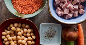 Tagliate a cubetti la Mortadella Bologna IGP. Componete il piatto mettendo sul fondo i ceci, quindi le lenticchie ancora calde ed infine la Mortadella Bologna IGP.