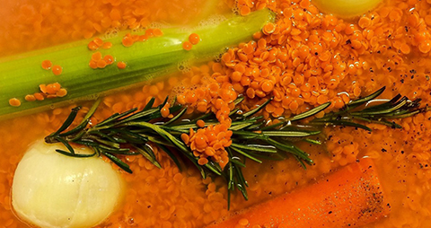 In una pentola ponete carota, sedano, cipolla, le lenticchie rosse decorticate, ricoprite di acqua e lasciate cuocere per circa 15 minuti. Aggiustate con sale e pepe.