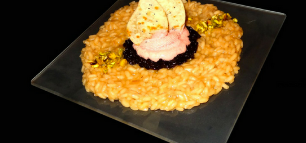 Disporre il riso IGP al centro del piatto ed il riso Venere a formare un cerchio più piccolo; al centro disporre la crema di Mortadella di Bologna e Squacquerone di Romagna e le due piccole piadine con semi di chia. Terminare con la guarnizione di pistacchio.