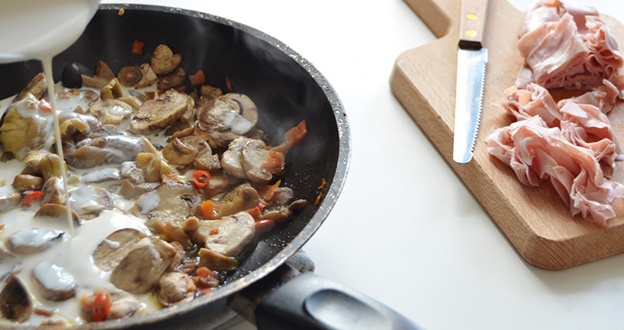 Quando i funghi sono teneri aggiungere la panna e lasciare insaporire per il tempo necessario alla pasta di cuocere (2-3 minuti).