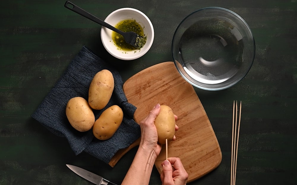 Infilate ogni patata su uno spiedo ad un centimetro dal bordo che farà da base.