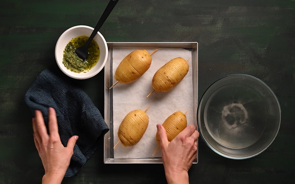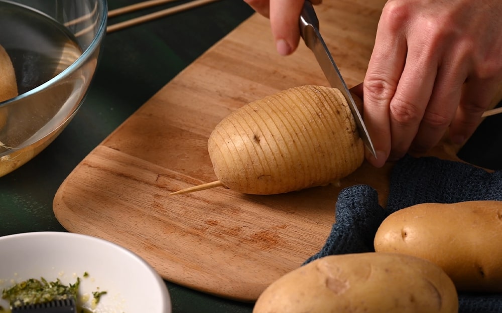 Incidete la patata in fettine sottili: lo spiedo farà in modo che non vengano incise fino alla base, lasciando la patata intera alla base. Lavate la patata per eliminare l’amido ed asciugatela con carta da cucina.