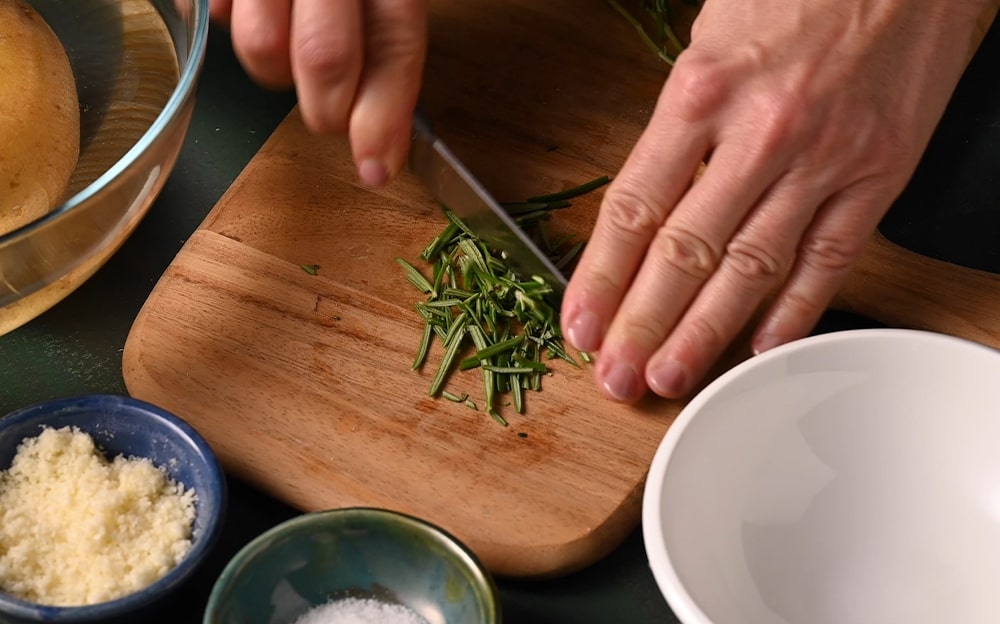 Mescolate le erbe aromatiche con sale ed olio e il formaggio e condite le patate riempiendo le fessure create dai tagli.