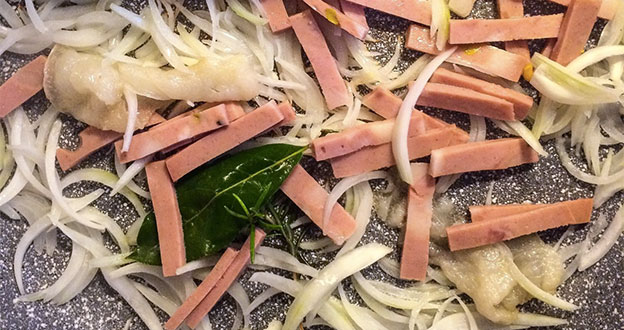 Nel mentre soffriggete la cipolla con il lardo e poi aggiungete la Mortadella Bologna IGP. Prima che la cipolla diventi dorata mettete nella padella le patate, in parte tagliate a rondelle e in parte schiacciate.