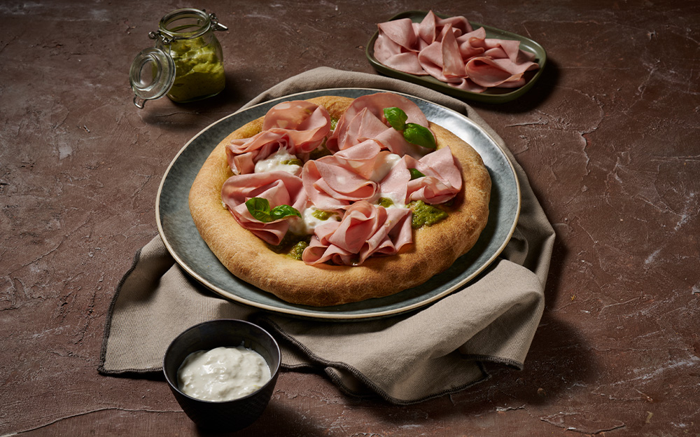 Volete preparare una pizza fatta in casa soffice e gustosa da farcire con la Regina Rosa? Con questa ricetta facile, otterrete un impasto leggero e saporito perfetto da farcire con il migliore degli abbinamenti: Mortadella Bologna IGP e burrata, un concentrato di gusto e freschezza assolutamente irresistibile, arricchito in questa versione dal sapore unico del pesto di basilico!