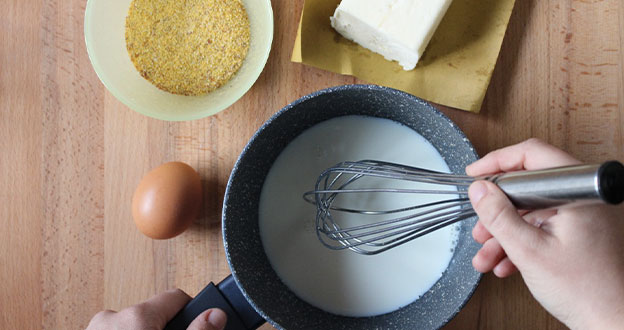 In una pentola capiente mettere a bollire un litro di latte, e poi versare a pioggia la farina di granoturco e una presa di sale.