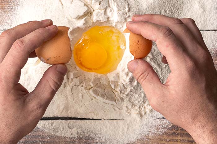 Il giorno dopo puoi occuparti della pasta fresca. Su una spianatoia di legno, disponi la farina a fontana e versa l’uovo nel centro. Impasta con le mani fino a ottenere un composto omogeneo ed elastico, che porrai a riposare in luogo fresco e asciutto per mezz’ora circa.