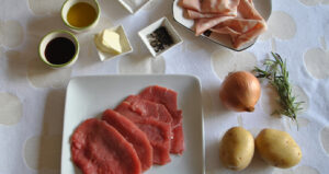 In una padella, fate rosolare la cipolla tagliata in 50 g di burro e un po’ d’olio. Fate cuocere le fette di vitello da entrambi i lati. Sfumate con il vino rosso e aggiustate di sale e pepe.