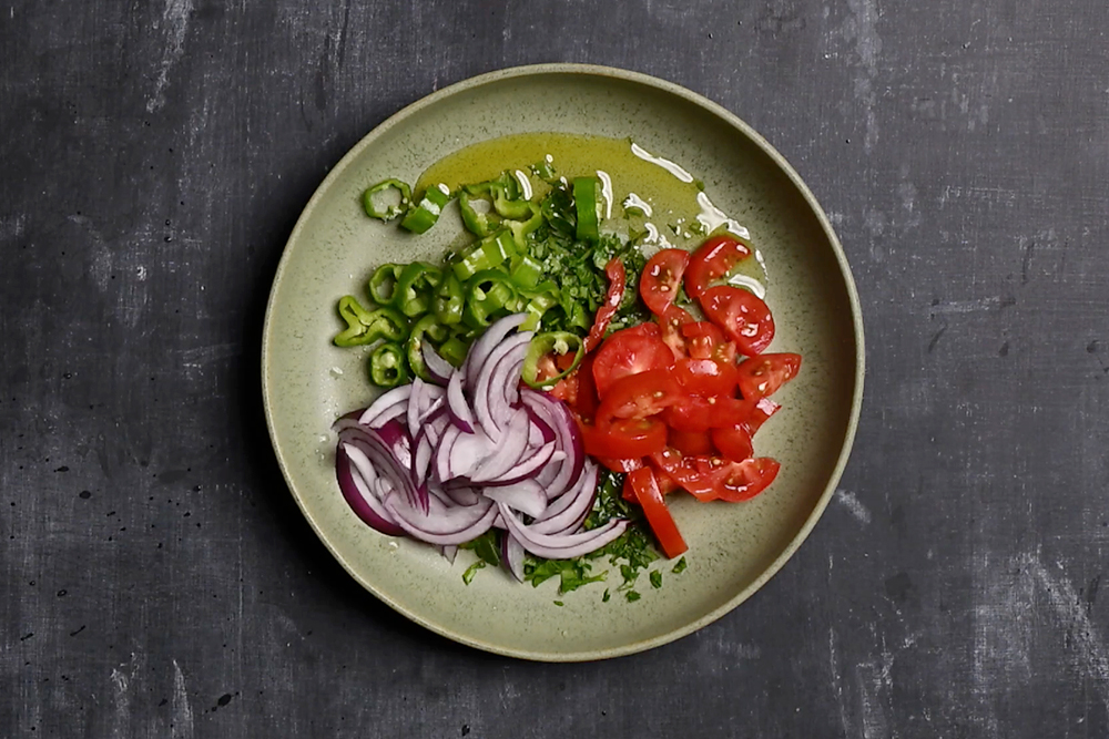 Affetta la cipolla, taglia i pomodorini e i peperoni e metti tutto in una ciotola. Trita il prezzemolo, aggiungilo alle verdure e condisci con sale, olio e succo di lime.