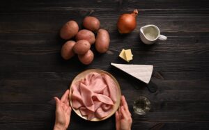 Foderate una padella che possa andare in forno con qualche fetta di Mortadella Bologna IGP. Fate uno strato di patate, mettete parte delle cipolle, il brie fuso e una fetta di Mortadella Bologna IGP.