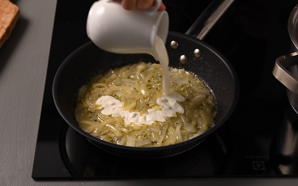 Cuocete le cipolle affettate in una padella con il burro, sfumatele col vino bianco, aggiungete la panna e lasciate cuocere fino a che non saranno ben morbide.