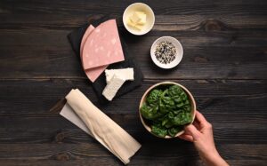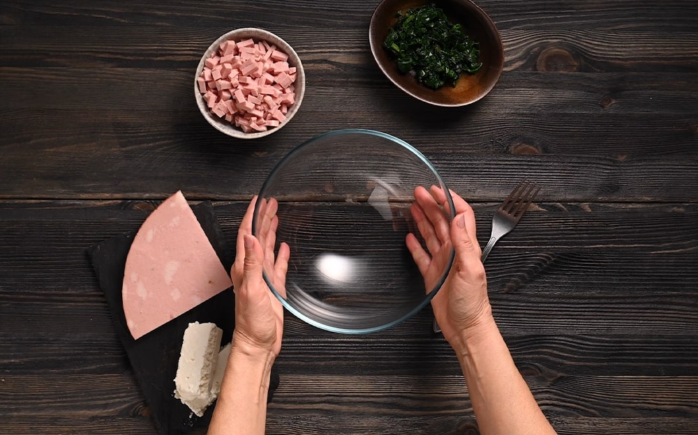 In una ciotola unite la Mortadella, la feta sbriciolata e gli spinaci tritati formando il ripieno delle tiropita.