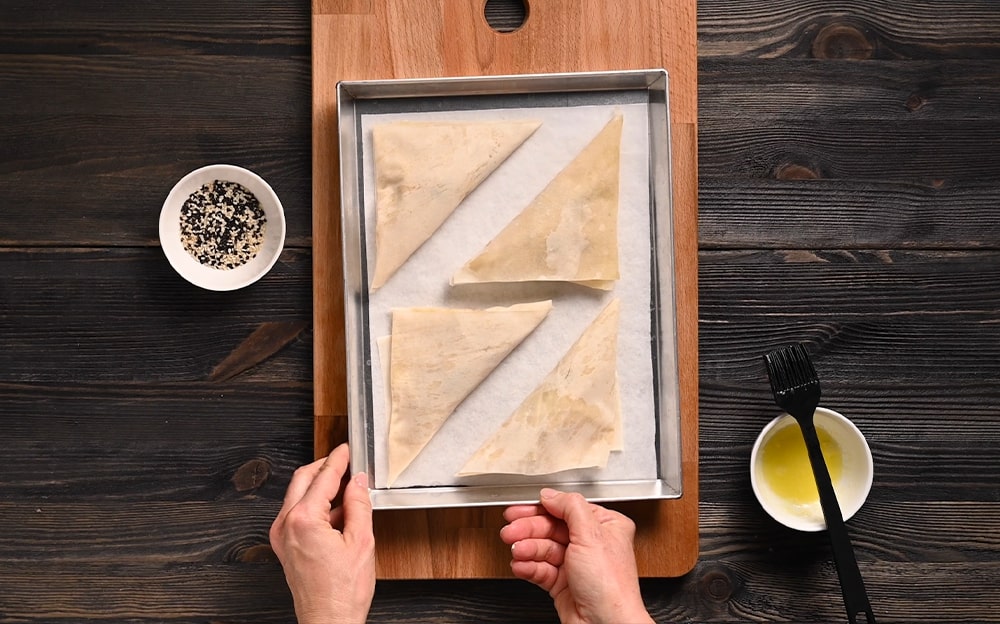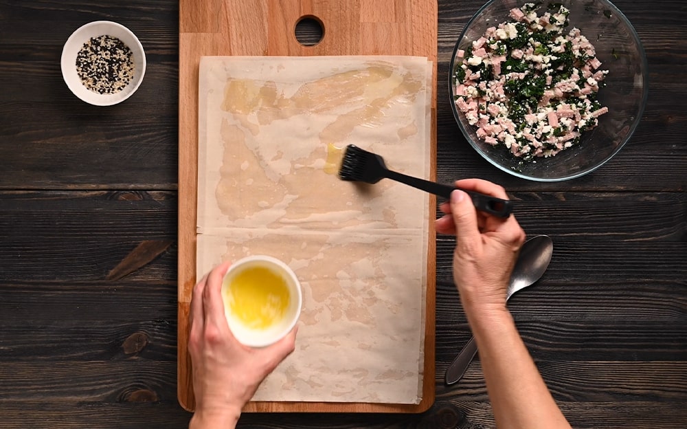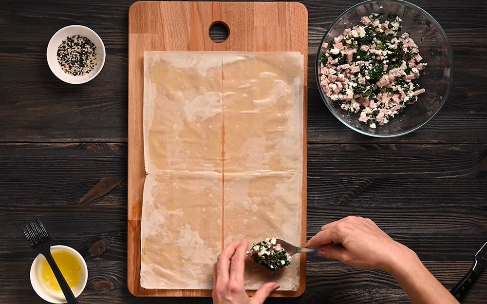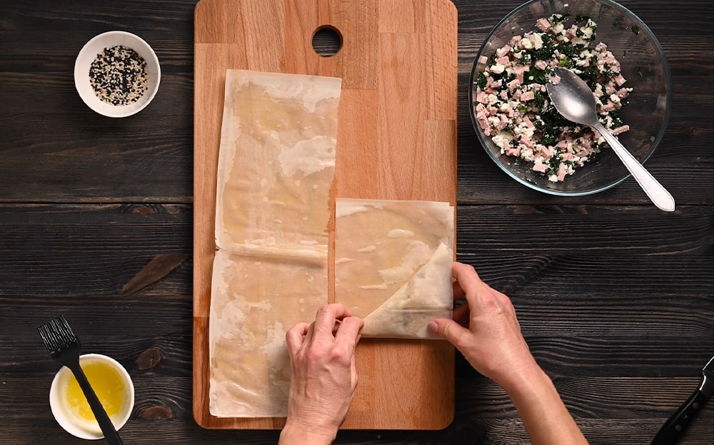 Sovrapponete due fogli di pasta fillo, spennellandoli con il burro fuso.