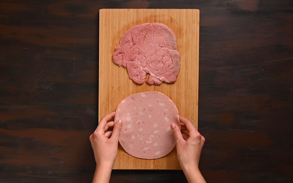 Battete la carne per renderla molto sottile, circa 3 mm. Stendete una fetta di Mortadella Bologna IGP e adagiatevi sopra una fetta di carne.