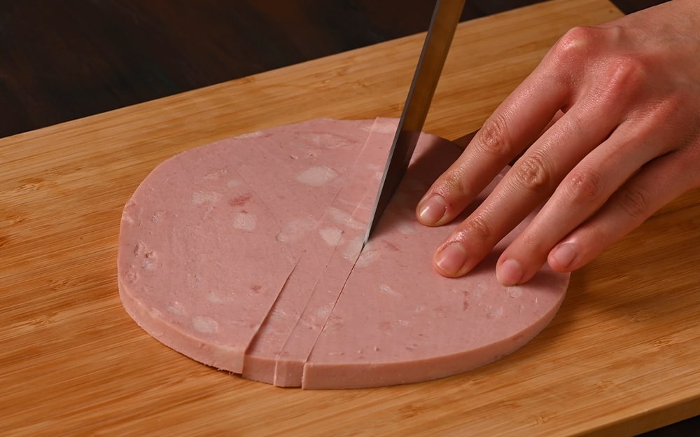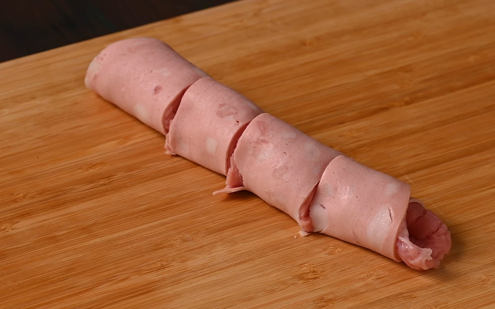 Tagliate la fetta spessa di Mortadella Bologna IGP in bastoncini da circa 1 cm x1cm e della lunghezza degli involtini.