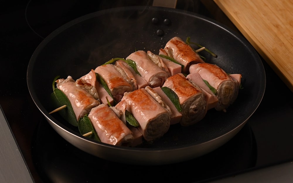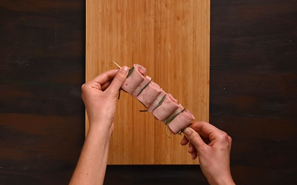 Infilzate 4 involtini per spiedino, alternandoli a foglie di salvia e ai bastoncini di Mortadella Bologna IGP.