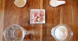 Preparare la pastella in una ciotola unendo la farina con l’acqua e il lievito. Impastare energicamente.
